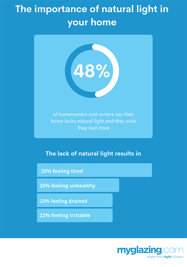 In our recent survey of 1,000 UK homeowners and renters, unsurprisingly we found that natural light (or lack of) was one of the top factors contributing to wellbeing in the home. In fact, it turns out that a lack of natural light in homes is making many of us miserable, with 48% of people saying their home lacks natural light or they wish they had more, resulting in more than a third feeling fatigued and one in four people feeling unhealthy.